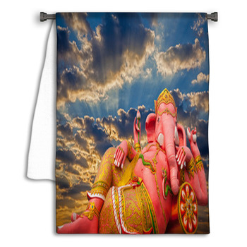 A vibrant pink and gold elephant with intricate patterns and a large wheel on its back is depicted against a backdrop of a blue sky with fluffy white clouds. The elephant is positioned on the right side of the image, and the scene is framed by a white towel with a silver rod on the left side. | Pink Ganesha Statue Wat Samarn Chachoengsao Towel | f80e4a2a88801e15d76e196f9f8e6ec767ece4180b8638c638b61214da1dfc4f | 000910708731 | 0 | 0 | 57 | 7 | 0 | 0 | |