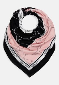 A black and white scarf with a pink and black patterned center is displayed against a white background. The scarf is folded into a neat, circular shape with the ends tucked under. The pattern features a mix of geometric shapes and abstract designs. The brand name 'Calvin Klein' is visible on the bottom edge of the scarf. | Calvin Klein - FLORAL SCARF - Skjerf - black | 63f2341044c942cf3397121b4ad956e72ebffc59c7eb6de0d44ad114fa9ea830 | 000910708832 | 0 | 0 | 57 | 9 | 0 | 0 | |
