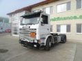 A white semi-truck with a black grille and orange license plate is parked in front of a building with a green sign that reads 'RELIANCE'. The truck has a large black cab and a flatbed trailer. The building has multiple windows, and there is a car parked to the left of the truck. | Scania 93, 1998, Dragbilar | 81c948e671eead619f59bac69b56dc5c2a990311ba45e74de5cc7293904b1174 | 000910708736 | 0 | 0 | 53 | 4 | 0 | 0 | |