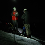 Two climbers are preparing to ascend a snowy mountain slope at night. They are equipped with backpacks, ice axes, and climbing gear. One climber is wearing a red jacket, while the other is in a black jacket. They are standing on a snow-covered slope with their equipment scattered around them. The scene is illuminated by a headlamp, casting a warm glow on the snow. | nocturna, Volcan Lanin | 91af226aa903686482597fee2420f9767c660e42ddad9d6472ad6a84845c7338 | 000910708742 | 0 | 0 | 64 | 3 | 0 | 0 | |