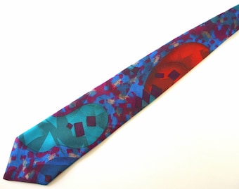 A colorful tie with a geometric pattern is displayed against a white background. The tie has a blue base color with red, green, and yellow accents. The pattern consists of various shapes and sizes of circles and squares, creating a vibrant and eye-catching design. | Vintage 1980's Wide Tie - Turquoise, Blue and Red Abstract Tie | 218fe8812fa554534d91b97fa917591075823488aa5a8bfbd8fdc3b151ccb204 | 000910708958 | 0 | 0 | 44 | 11 | 0 | 0 | |