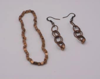 A pair of earrings and a necklace made of brown metal with a textured surface are displayed on a white background. The earrings have a circular design with a loop at the top, while the necklace features a series of circular links. | Copper Earring and Bracelet Set | e781dd2c119192bcd3b2b93ffeb8c47e5c04359fc59a49f500e5cb6397d086e9 | 000910709088 | 0 | 0 | 42 | 5 | 0 | 0 | |