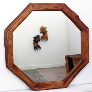 A wooden-framed mirror with a circular shape is mounted on a wall. The mirror reflects a wooden bench and a pair of brown leather gloves hanging on the wall. The gloves are positioned slightly above the bench, and the reflection shows the gloves hanging in the air. | Handcrafted 34-inch Teak Octagon and DIA Oak Oil Mirror , Handmade in Thailand | 025902e4e32a306e42bc9ceb5a13ddcc049759d4f05f441b5f15ab3f45d4d723 | 000910709145 | 0 | 0 | 47 | 13 | 0 | 0 | |