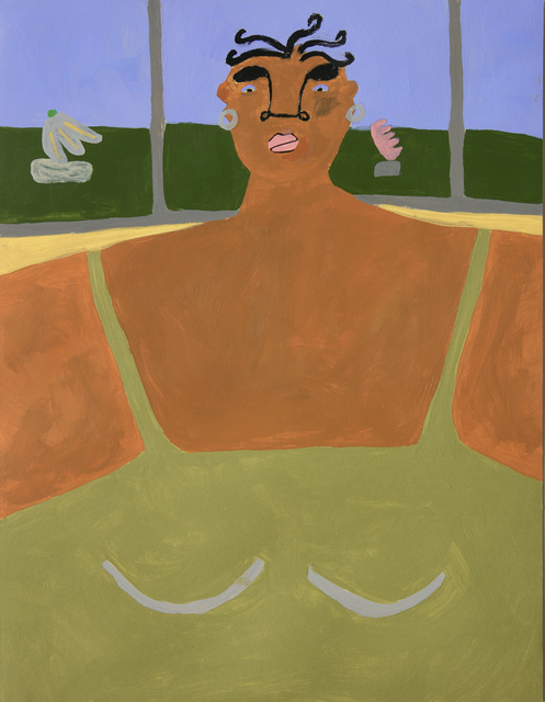 A painting of a woman with a large, round face and a prominent nose, wearing a green tank top. She has dark hair styled in a bun and is wearing earrings. The background features a window with a view of a green landscape and a blue sky. The painting has a textured, almost three-dimensional appearance, with the woman's face and the window frame being the most detailed areas. | , ' Portrait In Front Of Museum Window,' 2018, Ochi Projects | fc0371ed3969defae3d302c842868646d1a0dd7b3793b550e36f7d676f5a8166 | 000910709144 | 0 | 0 | 68 | 11 | 0 | 0 | |