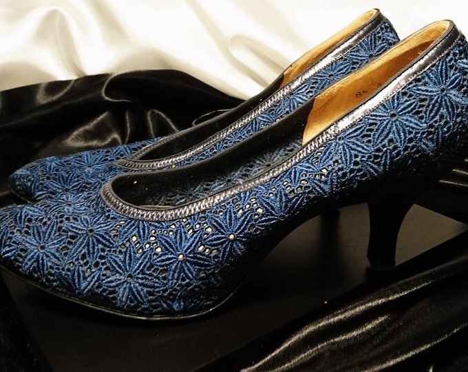 A pair of blue high-heeled shoes with a floral pattern on the toe and a wooden heel is displayed on a black velvet cloth. | Vintage 50's stiletto heels, Rosetta by Bective, royal blue high heel vintage shoes, crochet heels | bb1e92fef23e4ee4b43e06e28f48b0141c08d4103991a64d0b4b749b21f3d449 | 000910709218 | 0 | 0 | 24 | 15 | 0 | 0 | |