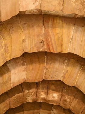 The first image shows a close-up of a stone archway with a textured surface. The arch is composed of multiple layers of stone, each with a different shade of brown, creating a gradient effect. The stones are weathered, with some showing signs of erosion and wear. The arch is set against a dark background, which accentuates the texture and color of the stones. | Roof arches in the Urn Tomb at Petra | 7f339564d683ee7041990e3590e256da36a90b454b8a9dcda91fe12ed14c3046 | 000910709127 | 0 | 0 | 63 | 8 | 0 | 0 | |
