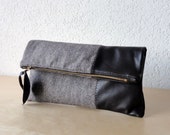 A black leather handbag with a textured surface and a gold zipper is placed on a wooden surface. The handbag has a long strap with a silver buckle and a small gold tag attached to it. | Leather Clutch in Dark Chocolate Italian Leather and European Wool - Indie Patchwork Series | 21b2d2bf2d347fbbf4624bf79b88e312f2997c2fa9cb1351212a2b86d4189989 | 000910709269 | 0 | 0 | 36 | 14 | 0 | 0 | |
