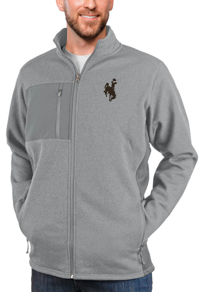 A man is wearing a grey jacket with a horse logo on the left side. | Antigua Wyoming Cowboys Mens Grey Course Long Sleeve Full Zip Jacket | a5ea4268721449247672bb99ae47e3e76041ae54c0c015d572071863c177d42f | 000910709270 | 0 | 0 | 15 | 11 | 0 | 0 | |