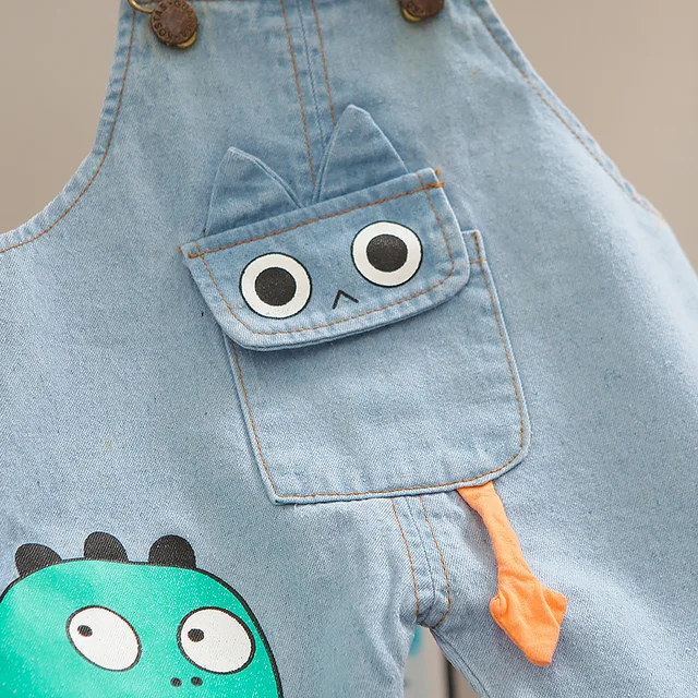 A pair of blue denim overalls with a cartoon cat face on the front pocket and a green cartoon character on the left leg. The overalls have a brown leather patch on the back waistband and a yellow zipper. | Baby Boy Overalls Set 5 | 930bfe6ba44a5c440a395380323383c30bcab05ccfa12f66e67e389bfc200a88 | 000910709297 | 0 | 0 | 39 | 5 | 0 | 0 | |