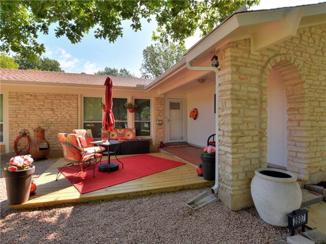 A cozy porch with a red rug, a red and white striped chair, a black and white striped chair, and a small black table with a red umbrella. There are two potted plants, one with pink flowers and the other with orange flowers. The porch is attached to a house with a stone wall and a white door. | 2807 Gabriel View Dr, Georgetown, TX 78628 (#1706671) :: Ben Kinney Real Estate Team | 0cb946583cdff97d747e503e5079e4f009d05bf1a49681a20c7df028174f3b02 | 000910709430 | 0 | 0 | 58 | 14 | 0 | 0 | |