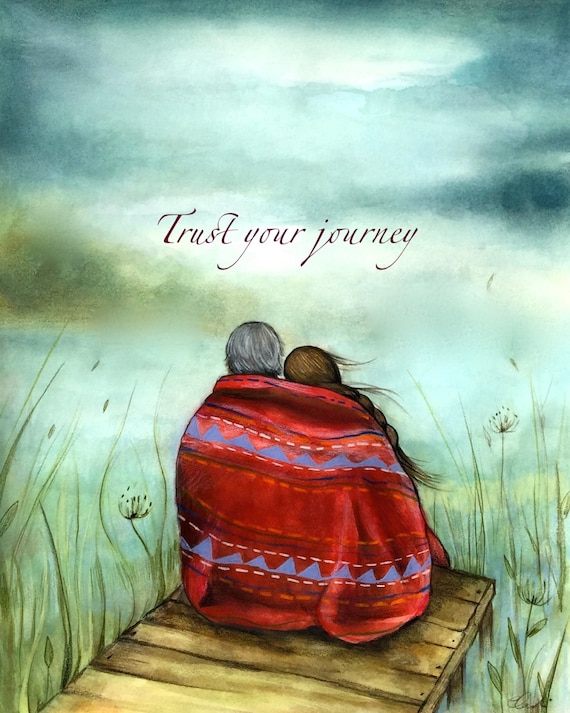 The second image is a watercolor painting of a couple sitting on a wooden bench in a field, with the man's arm around the woman. The sky is overcast, and the text 'Trust Your Journey' is written in cursive above them. The painting has a dreamy, artistic quality with soft colors and brush strokes. | Trust your journey art print | 23fa0f8ea541e3c8aa7355a661183069408bc9fe9192b892e315685f155a2270 | 000910709380 | 0 | 0 | 54 | 5 | 0 | 0 | |