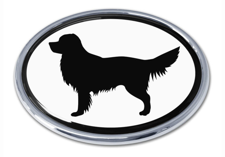 A black silhouette of a dog with a long tail and floppy ears is centered on a white background. The image has a glossy appearance, giving it a reflective quality. The dog's head is turned slightly to the left, and its body is facing forward. The silhouette is surrounded by a thin black border, and the overall image has a circular shape, suggesting it is a button or a round emblem. | Golden Retriever White Chrome Emblem | 8c40da85fca2c57209413ce16eb717fc58c9fefe0f60db1c306251e52d299dca | 000910709671 | 0 | 0 | 71 | 5 | 0 | 0 | |