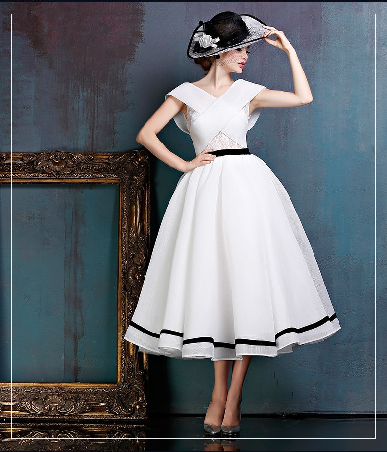 A woman is standing in front of a blue wall with a framed picture on the left side. She is wearing a white dress with a black belt and a black hat adorned with white flowers. The dress has a flared skirt with a black stripe at the bottom. The woman is looking upwards and to her right, with her left hand on her hip. | Best Wedding Dresses Tea Length | e040b2094fee6ef93417f7701de53571eeaae7ea10bbe1d1e94c6a5feafef510 | 000910709636 | 0 | 0 | 65 | 5 | 0 | 0 | |