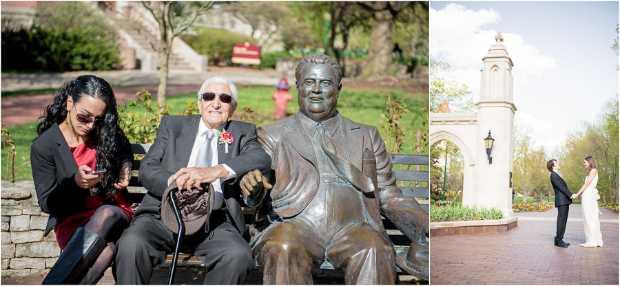 A man and a woman are sitting on a bench in a park. The man is wearing a suit and tie, and the woman is wearing a red dress. They are both smiling and looking at the camera. The man is holding a cane, and there is a bouquet of flowers on the bench next to him. | Quirky, fun, casual wedding photos on Indiana University campus | 6a0069adf8ab57fb18ab45fb3383a3bea6c212bc604925e892e45fae15022b01 | 000910709622 | 0 | 0 | 57 | 9 | 0 | 0 | |