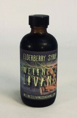 A small bottle with a black cap is placed on a white background. The label on the bottle reads 'Elderberry Syrup' and 'Wellness Living Coaching'. Below the text, there is an image of a person with a green aura, surrounded by greenery and a wooden table with a bowl and a spoon. The label also includes the website 'www.wellnesslivingcoaching.com'. | syrup, elderberry; 8 ounce; Wellness Living | fc545e9611c4cee9805fe28576e761ac58173aaa73021744ccf8d4e2cc854eab | 000910709755 | 0 | 0 | 59 | 6 | 0 | 0 | |