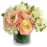 A bouquet of flowers in a clear glass vase. The bouquet consists of various flowers including roses, baby's breath, and other white flowers. The roses are predominantly pink with some yellow and white petals. The baby's breath is white, and there are also some green leaves and buds in the arrangement. The vase is green at the bottom and clear at the top. | Artificial Silk Mixed Floral Arrangements in Decorative Vase | f21d51da9e262d96508490e694d566769f70aa5df35a898162b1d34b904de103 | 000910709842 | 0 | 0 | 63 | 8 | 0 | 0 | |