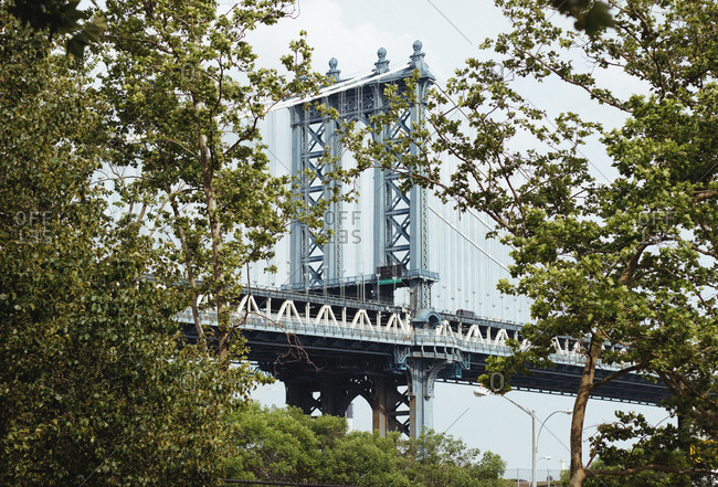 A large suspension bridge with a blue and white color scheme is visible in the background. The bridge is surrounded by lush green trees, and the sky is partly cloudy. The image is taken from a lower angle, looking up at the bridge, and the perspective is from the side. | Scenic view of manhattan bridge in new york city through leafy tree branches in misty day | 39de3f1c86331775bc04d1a815048a3e458a5483468a5b7f9a0e9c43c54fbfaf | 000910687306 | 0 | 0 | 50 | 16 | 0 | 0 | |