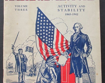 The cover of a book titled 'American History: Activity and Stability, 1850-1941' with a large American flag in the center, flanked by illustrations of historical figures and scenes. The cover is in a vintage style with a beige background and a red border around the edges. | The Pictorial American History Volume 3, by C W Airne | c3a9d27a11c175e1f2fe92ef451774196ff2197a1af4c3b74fcc103f81ddc07d | 000910687341 | 0 | 0 | 46 | 10 | 0 | 0 | |