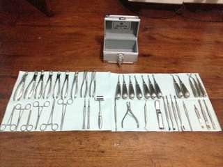 A set of dental instruments is neatly arranged on a blue cloth on a wooden floor. The instruments include various types of scissors, forceps, and other dental tools. A small metal box with a label is placed next to the cloth. | Amarrijje Oral Surgery Set | bf294b618f6206dcd45478c7a57559327d0f1b5770067bf9e6974c7a769fb4db | 000910687345 | 0 | 0 | 41 | 4 | 0 | 0 | |