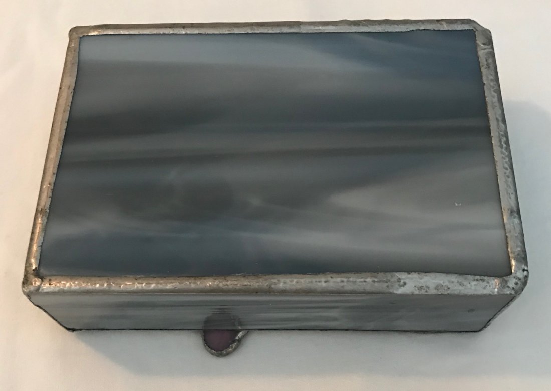 A silver box with a hinged lid, featuring a glass window that reveals a dark, cloudy interior. The box has a circular knob on the front and is placed on a white surface. | Stained Glass Trinket Box 5 x 3.5 - 3 | c220279a168a274274e2541e9d362dfb4899e6a1b57b603e6c2048938248e2ee | 000910687298 | 0 | 0 | 33 | 9 | 0 | 0 | |