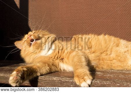 A fluffy orange tabby cat is lying on a wooden bench with its mouth open, looking upwards. The cat's fur is illuminated by sunlight, and its eyes are closed. The bench is placed on a surface with a shadow cast over it, and there is a blurred background with a patterned texture. | Red Fluffy Cat Lying On A Bench. Close Up | b9af163d381cfac035bb02c76e582468c4ed9319f89a734aa2d45bf7e34da3b5 | 000910687315 | 0 | 0 | 52 | 9 | 0 | 0 | |
