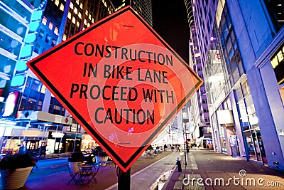 A construction sign with the words 'CONSTRUCTION IN BIKE LANE PROCEEDED WITH CAUTION' is mounted on a pole in a city street at night. The sign is illuminated by a streetlight, and the surrounding area is lit by various building lights. There are people walking on the sidewalk, and a few cars are parked along the street. | Construction in bike lane proceed with caution sig | 07af842d7d8c93d565fb11b01311479c09a69eaa9513f077d21c1815254331ca | 000910687410 | 0 | 0 | 57 | 8 | 0 | 0 | |