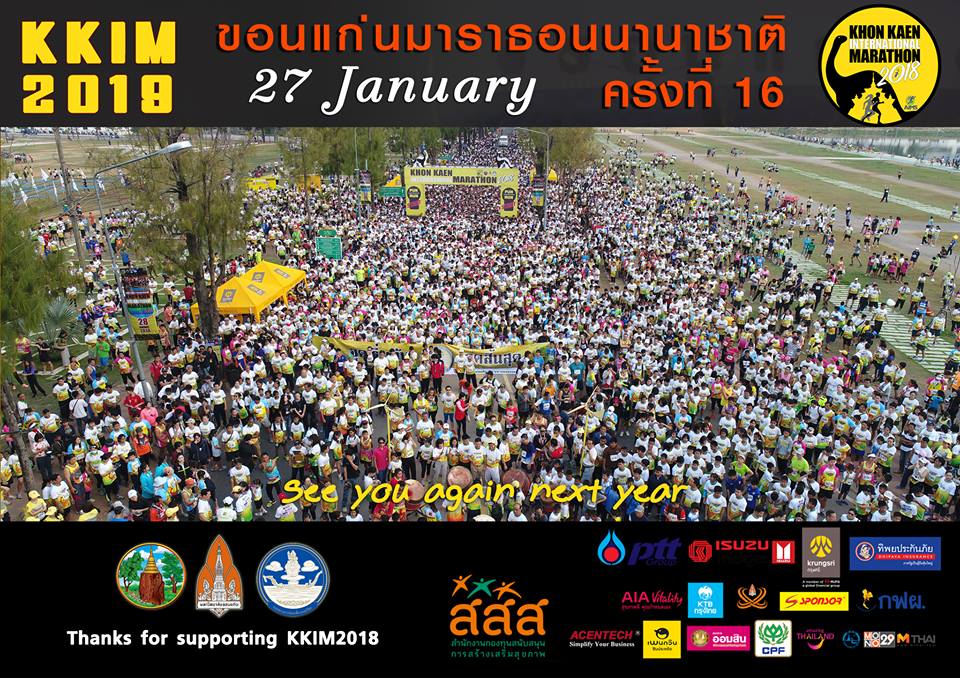 A large crowd of people gathered for an event, with a banner at the top reading 'KIM 2018 27 JANUARY'. The scene is filled with people of various ages, some wearing yellow shirts, and a yellow inflatable object is visible in the crowd. The atmosphere appears festive and busy. | Khon Kaen International Marathon 2019 | 861b442955b4bb683159f171fd79d4096912ae876eecd0762b30fbd95a4cdda3 | 000910687201 | 0 | 0 | 49 | 5 | 0 | 0 | |