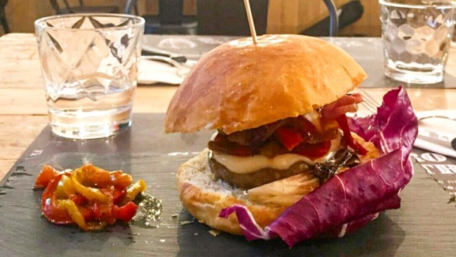 A gourmet burger with a sesame seed bun, topped with bacon, cheese, lettuce, tomato, and a fried egg, served on a black slate board. The burger is garnished with a purple cabbage leaf and accompanied by a side of pickled peppers in a small bowl. The setting includes a wooden table with a glass of water and a fork to the side. | Piatto - Civico 21, Senigallia | a58033b4b9b923428922b9e818045414904b561cbccb36a617bb3e4fa9221a9a | 000910710214 | 0 | 0 | 62 | 5 | 0 | 0 | |