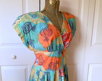 A mannequin is dressed in a vibrant, multicolored dress with a floral pattern. The dress has a fitted bodice with a high neckline and a flared skirt. The sleeves are short and puffy, and the dress features a belt at the waist. The mannequin is positioned in front of a white door with a round knob. | Vintage 80's cotton India block print Dress | 015b2a12186aff09e1d023fdd5c1d294b68465308e4568be30d621a1a0aed24c | 000910710140 | 0 | 0 | 56 | 7 | 0 | 0 | |