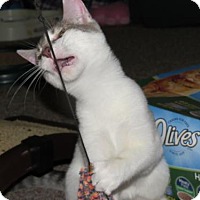 A white and brown cat with a pink nose is standing on a beige carpet, holding a red and blue toy in its mouth. The cat is looking upwards with its mouth open, and there is a cardboard box with the word 'OLIVES' on it in the background. | Adopt A Pet :: Pirate Bob - Philadelphia, PA | 58931dc69e5fab8f7c07708fb4a5e523cb9f584e76859ead0a6752bd8cc60b58 | 000910710146 | 0 | 0 | 48 | 9 | 0 | 0 | |