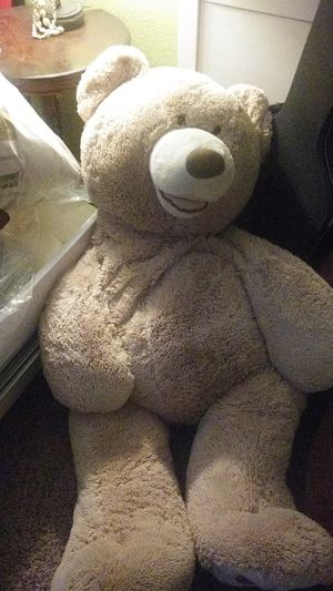 A large teddy bear with a white face and a brown body is sitting on a brown carpet. The bear has a happy expression with a wide smile and is positioned with its legs spread out. In the background, there is a wooden table with a white vase on it, and a black chair is partially visible to the right of the bear. | Large stuffed teddy bear approximately 4 ft tall by hug fun for Sale in Fallbrook, CA | eb0d20e1820483133e3983d63ebebacf989c209391abc88f20cf900f7b5c6585 | 000910710446 | 0 | 0 | 63 | 16 | 0 | 0 | |