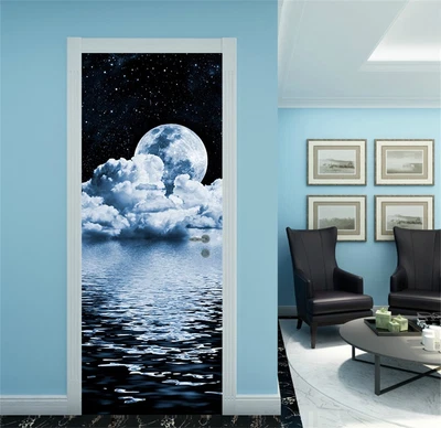 A living room with a large window showing a night sky with a full moon and stars, and a reflection of the moon and clouds on the water below. The room has a blue wall, a black leather armchair, a small round table with a green plant and a white cup, and a framed picture on the wall. | \xc2\xa3107.99 \xe2\x80\xa2 Buy 3D Moon Clouds 838 Door Wall Mural Photo Wall Sticker Decal Wall AJ WALLPAPER UK | c6b9d3de2e23fe288df3c1d4bdf28dd9c9c9cab9c19132bd7324a390c514f52e | 000910710600 | 0 | 0 | 58 | 18 | 0 | 0 | |