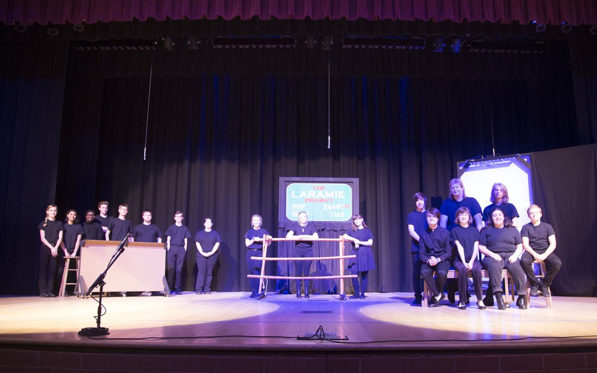 A group of people in black clothing are standing on a stage with a microphone stand to the left and a wooden podium in the center. The stage is lit with a blue light, and there are rows of seats in the foreground. The audience is not visible, and the stage is empty except for the performers. | Laramie Project_4.jpg | 0a1e3937c34b5ffa18c2f40819e88ffd6c023b87271c87fa45ba8407c7c1fb91 | 000910711131 | 0 | 0 | 57 | 2 | 0 | 0 | |