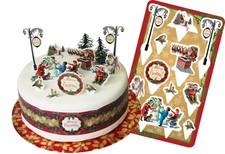 A white frosted cake with a red and green striped border is displayed on a table. The cake is adorned with various Christmas-themed decorations, including small figurines of people and animals, and a pattern of holly leaves and berries. A matching Christmas-themed card with a similar design is placed next to the cake. | Anniversary House Christmas Victorian Traditional Cake Topper Kit Decorations | 93554e604f16a491017cc85c2d6cf0b0592c5740801a232e7840b941b9091186 | 000910711227 | 0 | 0 | 53 | 9 | 0 | 0 | |
