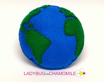 A plush toy of the Earth with a blue fabric surface and green stitching around the edges, featuring a detailed representation of continents and oceans. The toy is placed against a white background with a pink text overlay that reads 'Ladybug & Chameleon' and a small yellow and red flower icon. | Felt EARTH, stuffed felt Earth magnet or ornament,Earth toy, Space, Universe, Nursery decor,Earth magnet, Earth ,Earth ornament, Planet | af81d020b9291875fef9366b2819865afcc36f64096c35709e17267a91fd624f | 000910711127 | 0 | 0 | 51 | 18 | 0 | 0 | |