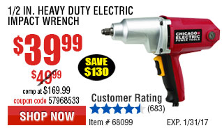 A red and black electric drill with a black and yellow handle is displayed on a white background. Below the drill, there is a red and white sign with a price tag of $34.99 and a 'SALE' sign with a red 'SALE' sticker. The sign also has a 'SAVE $130' sticker and a 'CUPON CODE' with a code number. Below the sign, there ar... | 1/2 in. Heavy Duty Electric Impact Wrench | c62dc6f83a07f989249a93e49ae0cda4cef726ff9d782e937b5f81e3fe20f961 | 000910711139 | 0 | 0 | 74 | 7 | 0 | 0 | |