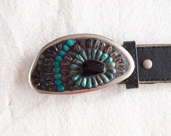 A silver belt buckle with a turquoise and black eye design is lying on a white cloth. | Womens Belt Buckle READY TO SHIP Mosaic Belt Buckle Colorful Buckle with Smoky Quartz & Semi Precious Stones includes Leather Belt | 34c39c6d19be05eaf5f7dfcb6088d84613f552ff2588bb53f5385f341b9e934f | 000910711176 | 0 | 0 | 17 | 21 | 0 | 0 | |