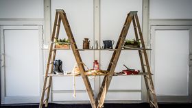 A wooden ladder is leaning against a white wall with various items on the rungs. The items include a pair of boots, a basket with plants, a wooden box, a mug, a bottle, and a pair of scissors. There is also a red tool on the bottom rung. | Image of a Vintage Ladder Display | 631a25e28bc61c66650bf32a5a58455e3c117ca45f1465f5d4d4571d6268dd04 | 000910687392 | 0 | 0 | 48 | 6 | 0 | 0 | |