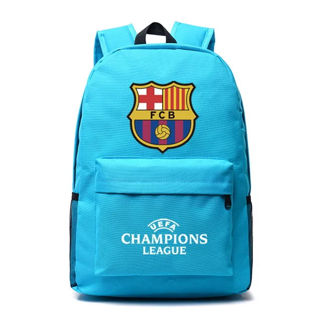 A blue backpack with a large embroidered design of a red and blue soccer ball with the word 'FCB' in white, surrounded by a red and blue shield with a white star, and the words 'CHAMPIONS LEAGUE' in white on the bottom. The backpack has a front pocket with a zipper and a smaller pocket on the top right corner. | ef83c7b3271e Logo Champions Backpack Bag Men Boys Barcelona Travel Bag Teenagers School Gift Kids Bagpack Mochila Bolsas Escolar | fd3b3a501d46ec0b2c3d88d701c03f172daceefb6be72ba55804beb5f663676e | 000910711854 | 0 | 0 | 60 | 18 | 0 | 0 | |