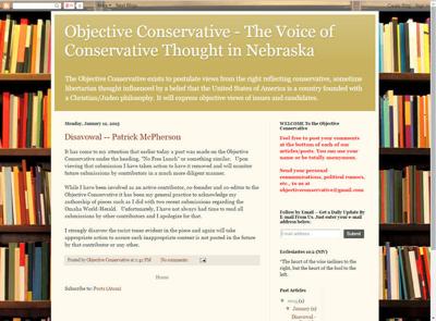 A screenshot of a webpage titled 'Objective Conservative - The Voice of Conservative Thought in Nebraska'. The webpage features a bookshelf background with various books, and the content includes articles and a call to action to 'Subscribe to our newsletter'. The webpage is designed with a conservative theme, using a c... | Staff Pat Mcpherson Must Be Held Responsible For Racist Blog Posts | 8f85ca7c80ac098cc3b74d13f26b61b63678162a0b85b2655714ae374f37335f | 000910711966 | 0 | 0 | 64 | 11 | 0 | 0 | |
