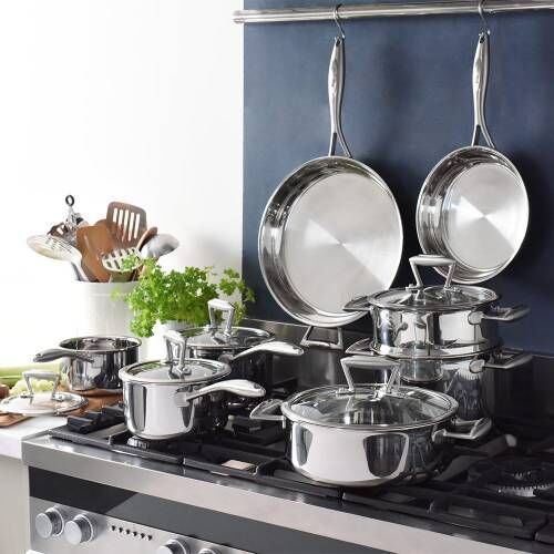 A stainless steel frying pan is hanging on a kitchen wall above a stove with various pots and pans on the burners. | Elite Tri-ply Cookware Set Uncoated 8 Piece | f9fa84f1b321a812aab2f26b43f4af26f53843032e56312200737868c8695389 | 000910711931 | 0 | 0 | 22 | 7 | 0 | 0 | |