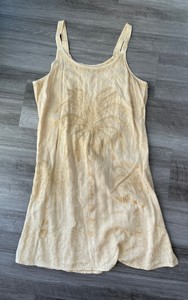 A beige tank top with a graphic design on the front is laid out on a wooden floor. The top appears to be stained with various substances, giving it a worn and aged look. The design on the front is a stylized bird or wing pattern, and the fabric of the top has a rough texture. | Raya Sun Beige Embroidered Palm Tree Dress S Mini Beach Sleeveless F6 | 08ccaa3df39e5bf495e48f70f944f4c084023b6a704cd5e49b33b85b60bc7578 | 000910712078 | 0 | 0 | 56 | 12 | 0 | 0 | |