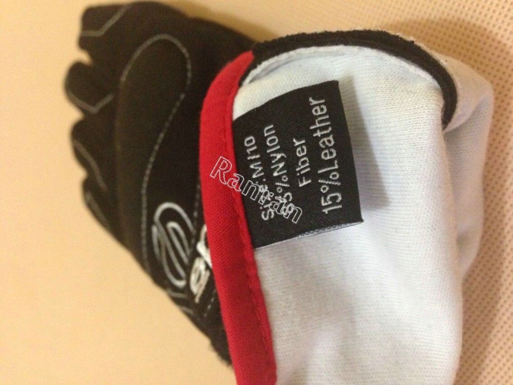 A close-up of a black and red sports glove with a white interior, featuring a label that reads 'RAMIO VON FINER 15% LEATHER'. The glove is placed on a surface with a beige background. | 2016 car racing gloves polyester leater windproof and fireproof size M L XL fit men and women | 7c0e6df43b8cf6f567821e412b28e42109cf33f53adfe9f77f9678cf98096fa8 | 000910712056 | 0 | 0 | 34 | 17 | 0 | 0 | |