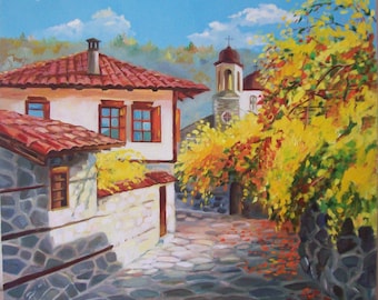 A vibrant painting depicts a quaint village scene with a red-tiled roofed house on the left, a stone wall with a wooden door in the center, and a church with a bell tower in the background. The foliage is lush and green, with a few yellow leaves scattered around. The sky is clear with a few clouds, and the overall atmo... | Bulgarian village | 523c6965f814ccbcf23e1a2e82aa6df1e1755f25f1ad8f7bb6e511d575d396a5 | 000910712464 | 0 | 0 | 65 | 2 | 0 | 0 | |