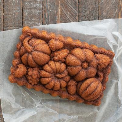 A brown, glazed pastry with a pumpkin design sits on a piece of wax paper. The pastry has a textured surface with a variety of pumpkin shapes and sizes, and it appears to be a type of cookie or cake. The wax paper is placed on a wooden surface, and the overall image has a warm, autumnal tone. | Molde pastel Nordic Botanic Pumpkin Loaf Pan | 50b4e9257f9c5ed70b0aa7e0d7c7c8d55d65911896c1b6601a79b703da5bf445 | 000910712512 | 0 | 0 | 58 | 7 | 0 | 0 | |