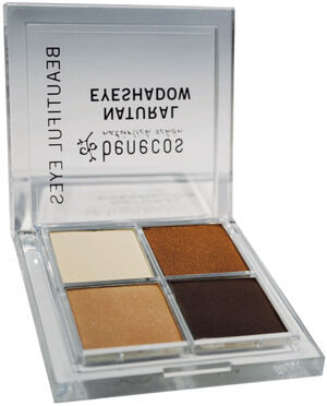 A compact makeup palette with a clear plastic cover is open, displaying four shades of eyeshadow. The palette is labeled 'EYESHADOW PALETTE' and 'BEAUTIFUL EYES' in black text. The eyeshadows are arranged in two rows, with the top row having shades of brown and beige, and the bottom row having shades of brown and black... | Natural Quattro Eyeshadow | 49768cb3dfc7cd31b5b864b2f5322832ba33a827f6661b130086b99fb608e374 | 000910712558 | 0 | 0 | 63 | 3 | 0 | 0 | |