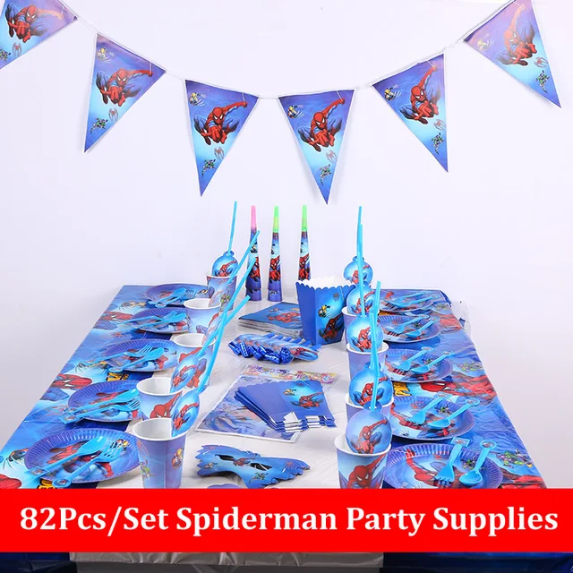 A table is set with blue and red Spiderman themed party supplies, including plates, cups, and utensils. The table is adorned with a Spiderman banner and bunting, and there are lit candles in the shape of Spiderman's head. The tablecloth has a blue Spiderman design, and there are additional Spiderman decorations scatter... | 82pcs Spiderman Birthday Party Supplies Disposable Plate/Cup/Tablecloth/Fork/spoon napkin Baby Shower Decoration kids Favors | 918001e102053ff7e602a22c4f79c0f705ca31005c230d181e3b8ba3b0d0f5b3 | 000910712843 | 0 | 0 | 55 | 13 | 0 | 0 | |