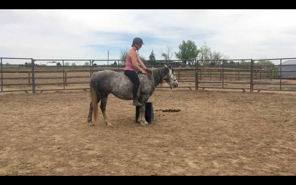 A woman is riding a horse in a dirt arena with a fence around it. The horse is standing on a small mound of dirt, and the woman is wearing a pink top and a black helmet. The sky is partly cloudy, and there are trees in the background. | Picture of Odin standing at the mounting block with Sarah mounted bareback. | d5f2d75aaa2ccaca7ddd2c4eb1272691042527166dc8120824a60a02ba4e951f | 000910712804 | 0 | 0 | 49 | 12 | 0 | 0 | |