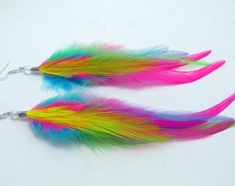 A pair of colorful feather earrings with a gradient of pink, blue, yellow, and green hues. The feathers are attached to a silver earring hook. | Neon Feather Earrings - Colorful Rainbow Feather Earrings - Electricity | 01af05ef48751e8956c83b66d9f910773ccf0c62f6b9f35685b043934087d978 | 000910712828 | 0 | 0 | 25 | 10 | 0 | 0 | |