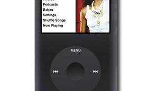 A black iPod with a white screen displaying the words 'Extra Podcasts', 'Settings', 'Shuffle Songs', 'New Playing', and 'Menu' in white text. The iPod has a silver scroll wheel and two buttons below the screen. | IPod classic 160 GB | 79aea212f286c9036a6f87bae2314916543c2947298a298c9f1d22e221881521 | 000910712846 | 0 | 0 | 35 | 4 | 0 | 0 | |